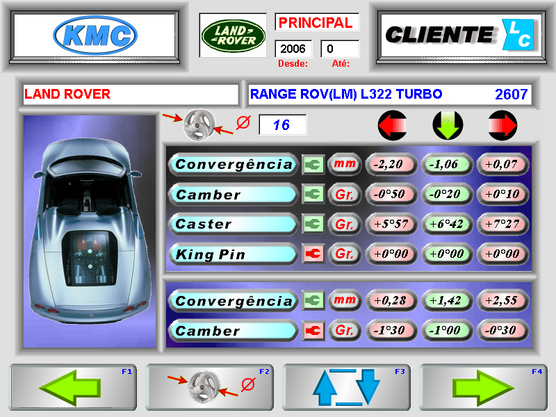 Tabela de alinhamento: Convergência, Câmber, Caster.